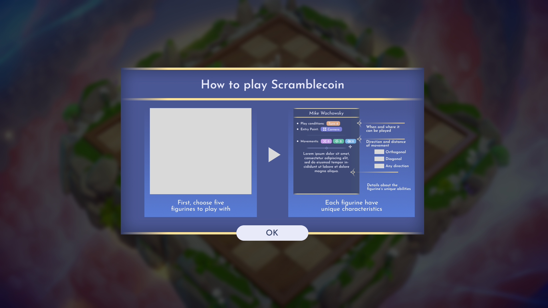 After making some mid-fidelity wireframes, I came to the conclusion that to make it more digestible, the tutorial needed to be break down into smaller steps, so that players don't have too much information all at once. By doing so, it makes it easier to grasp the Scramblecoin rules.