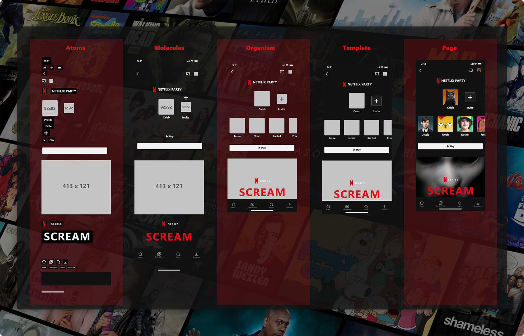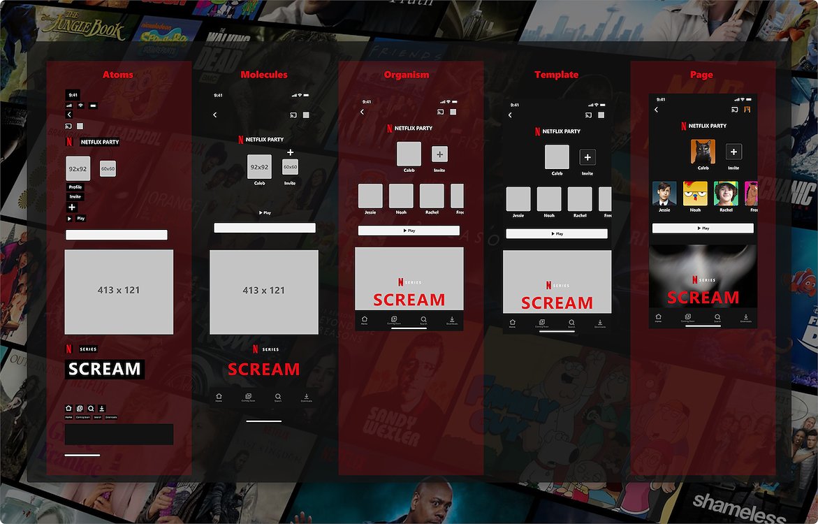 As I wanted to keep my decisions based on the original Netflix’s Style Guide so the new feature would fit perfectly to the app, I created an atomic design. By breaking down the app into components, I was able to see which one will I need to reuse the most in the high-fidelity prototype.