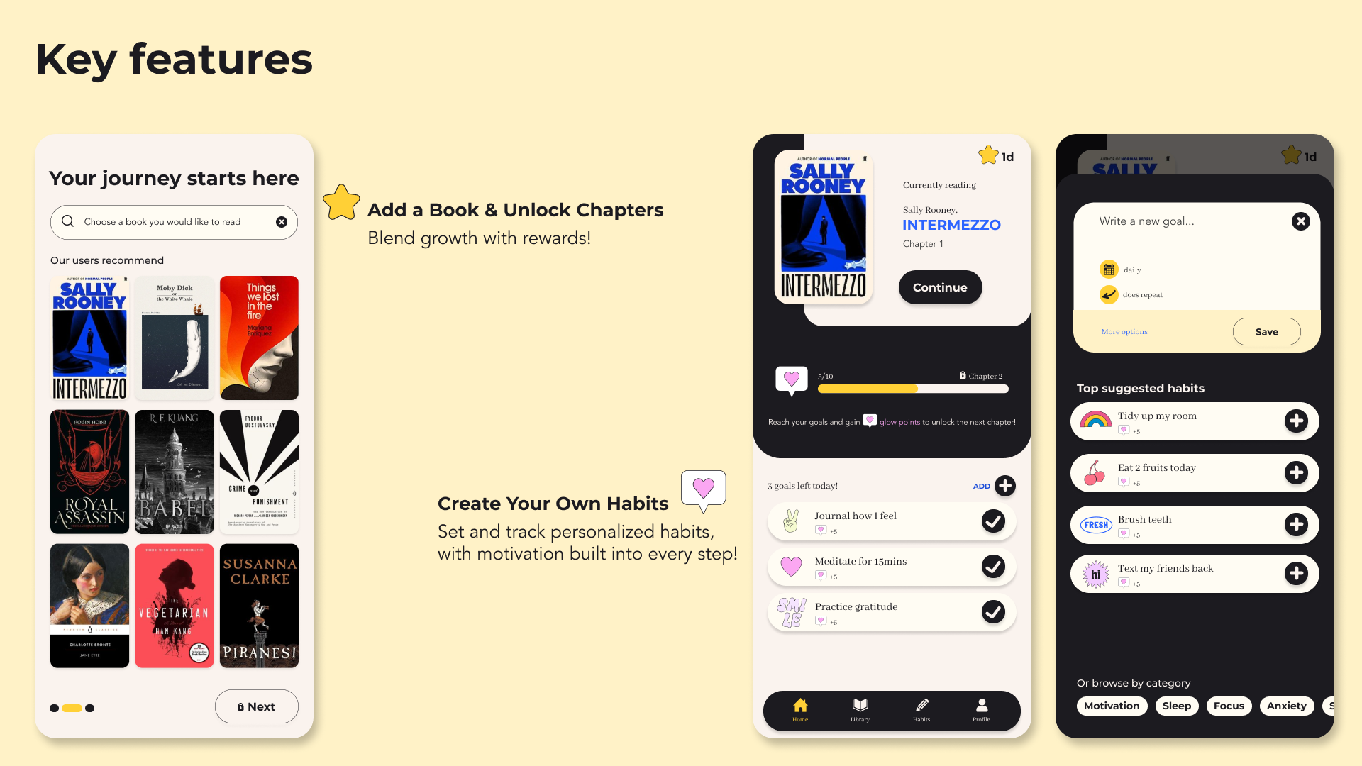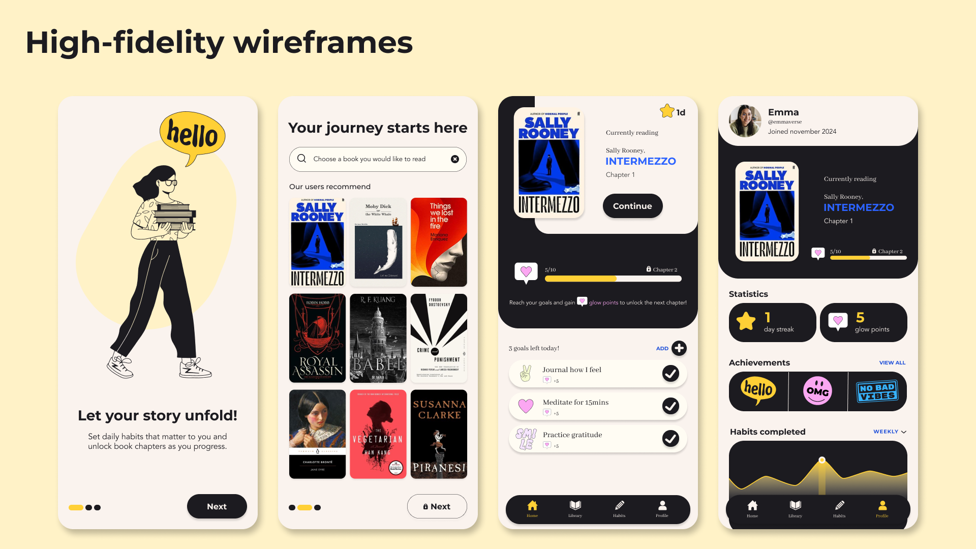 The objective was to create an easy to use product where users can set, track and share their goals, with rewarding aspects inspired by BookTok.